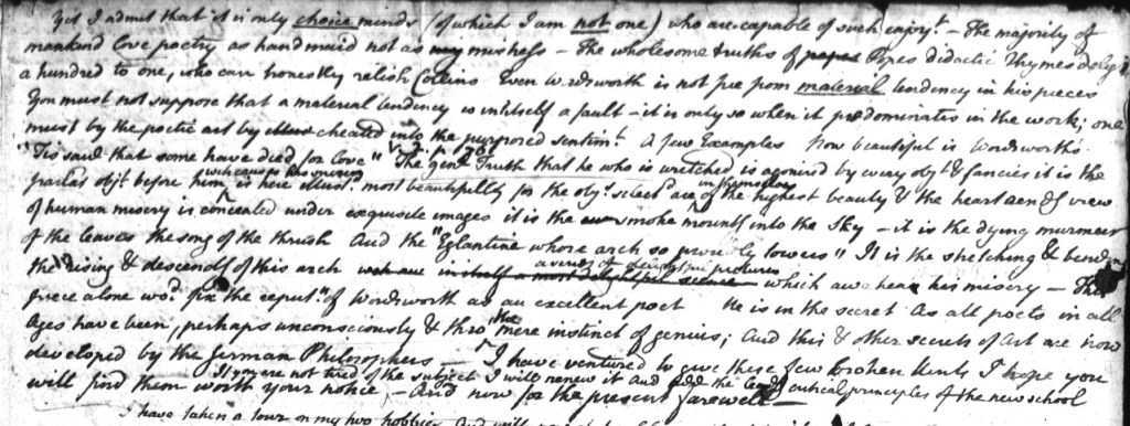 In such terms, Robinson will have introduced Herder to Lyrical Ballads in 1803, to great admiration, and also disseminated Blake’s poetry in Germany, in an 1811 article in the Vaterländisches Museum. And whereas scholarship has for some time been aware of Robinson’s private tutorials for Madame de Staël in German philosophy and its implications for art in Weimar in early 1804, his hitherto unpublished ‘Notebook for November 1805–December 1806’ suggests that he did the same for William Hazlitt after his return to London in late 1805. The Notebook also testifies that Robinson disseminated Kant’s philosophy in day-to-day conversations, for instance with Anna Letitia Barbauld, Thomas Holcroft, and other prominent figures of London’s literary scene.