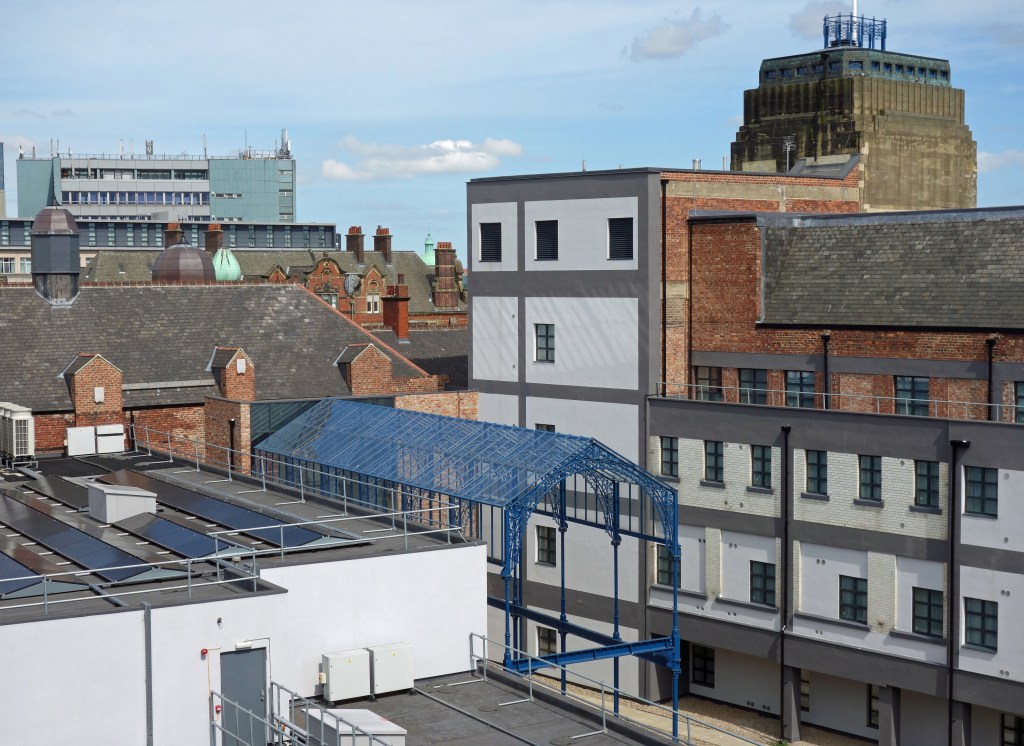 A rooftop car park may seem an odd choice, but this is a very special rooftop. It lies at the rear of Newcastle’s 1930s art deco co-op (right). The society’s original store was erected in 1886, and extended in 1902; the 1886 and 1902 sections were linked by a pair of three-storey ironwork arcades, meeting at right-angles. When the art deco block replaced the 1886 building, it completely concealed the 1902 arcade, which only came to light in 2014–16 during conversion work. It is a rare, possibly unique, example of a co-op arcade.
