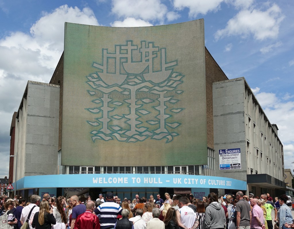 Hull’s co-op emporium was destroyed by fire and bombing in May 1941. Construction of its replacement eventually began in 1954. One end of the store formed a concave curve, covered with a community-themed mural designed by artist Alan Boyson (1930–2018). His massive Three Ships mosaic (1963) celebrates the city and its fishing industry; it is the largest of England’s four surviving 1950s–60s external co-op store murals (others are at Ipswich, Stevenage and Scunthorpe). However, Hull’s store is due for demolition. The mural itself, although listed Grade II, faces an uncertain future.