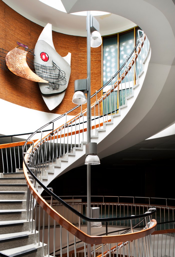 England’s co-op store numbers eventually peaked at around 28,000 in the early 1960s, when several impressive department stores were erected. Sheffield’s CWS-designed Castle House (1960–4) was one of the most unusual, with its near-windowless black granite elevation. Internal design was luxurious and up-to-the-minute, with much terrazzo and abstract patterned ceramic tiling. Excitement was provided by three full-height staircases, particularly the stunning, free-standing spiral stair; the ‘fish and fowl’ sculpture at its head indicated the presence of the top floor restaurant. This was equipped with a suspended ceiling, only the second in Europe at the time.