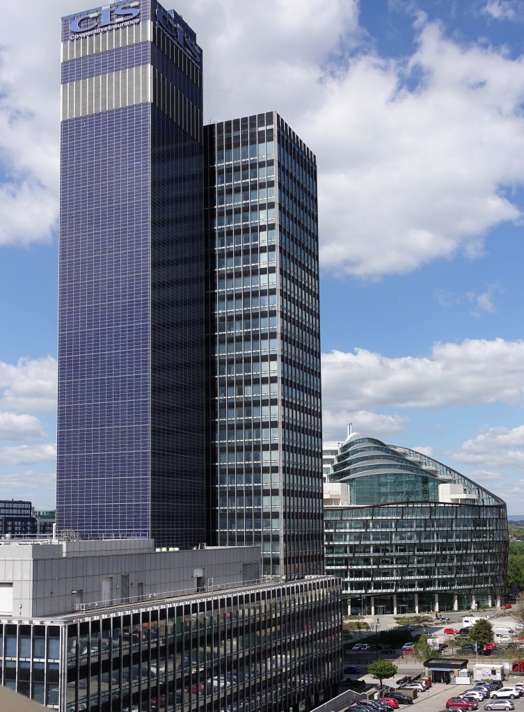 The Co-operative Insurance Society (CIS) merged with the CWS in 1913, and by the 1950s had grown impressively. From 1953 the CIS began to look for better office accommodation, eventually joining the CWS in a development north of its Manchester headquarters. Excavations for a 25-storey tower began in August 1959. The CIS Tower, then the tallest occupied building in the UK, opened in August 1962. Its 400ft (122m) concrete service block (left) was originally faced with grey ceramic mosaic, but was overclad in 2004–5 with photovoltaic panels. Beyond the CIS Tower is the Co-op Group’s headquarters, One Angel Square (2010–13).
