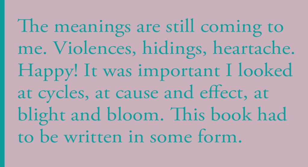 In fact, it was only when I was ordering the poems, when my editor Deryn asked me what I was trying to say, that I had to work it out. The process of ordering helped. And the meanings are still coming to me. Violences, hidings, heartache. Happy! It was important I looked at cycles, at cause and effect, at blight and bloom. This book had to be written in some form. It came in short bursts as all my writing does, mainly put together during the pandemic after I was lucky enough to be offered publication.