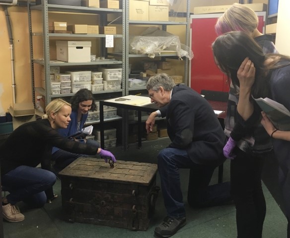 Our questions focused on the materiality of the object-its form, colour and feel-in order to help participants of the projects go ‘back to basics’ and reinterpret assumptions about the movement of objects 1000-1700. The usefulness of returning to the consideration of material qualities of things and the way things can push back on us, was underlined when, during our handling session of a sixteenth century goldsmiths trade guild chest in the Grosvenor collection, we became aware that the key would not open the chest. Like the medieval pilgrims to shrines who wanted to see inside, we tried to peep through holes and force the key to open to reveal what was inside. This confrontation with the object reminded us of Bruno Latour’s Berlin key or Bill Brown’s proposition that we begin to ‘confront the thingness of objects when they stop working for us’. Here, suddenly the key, something we take granted everyday, becomes a thing that matters and an agent. In addition, looking closely at the lock system of the key revealed that a person would need more than one key to open it, pointing to a social contract in place between the guild members who used it.