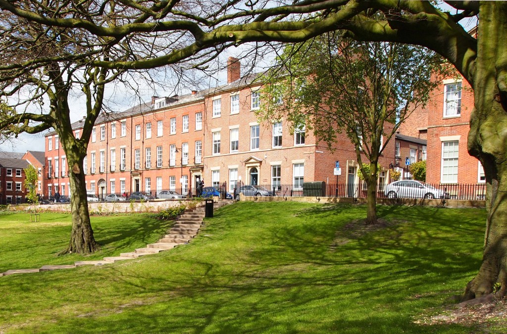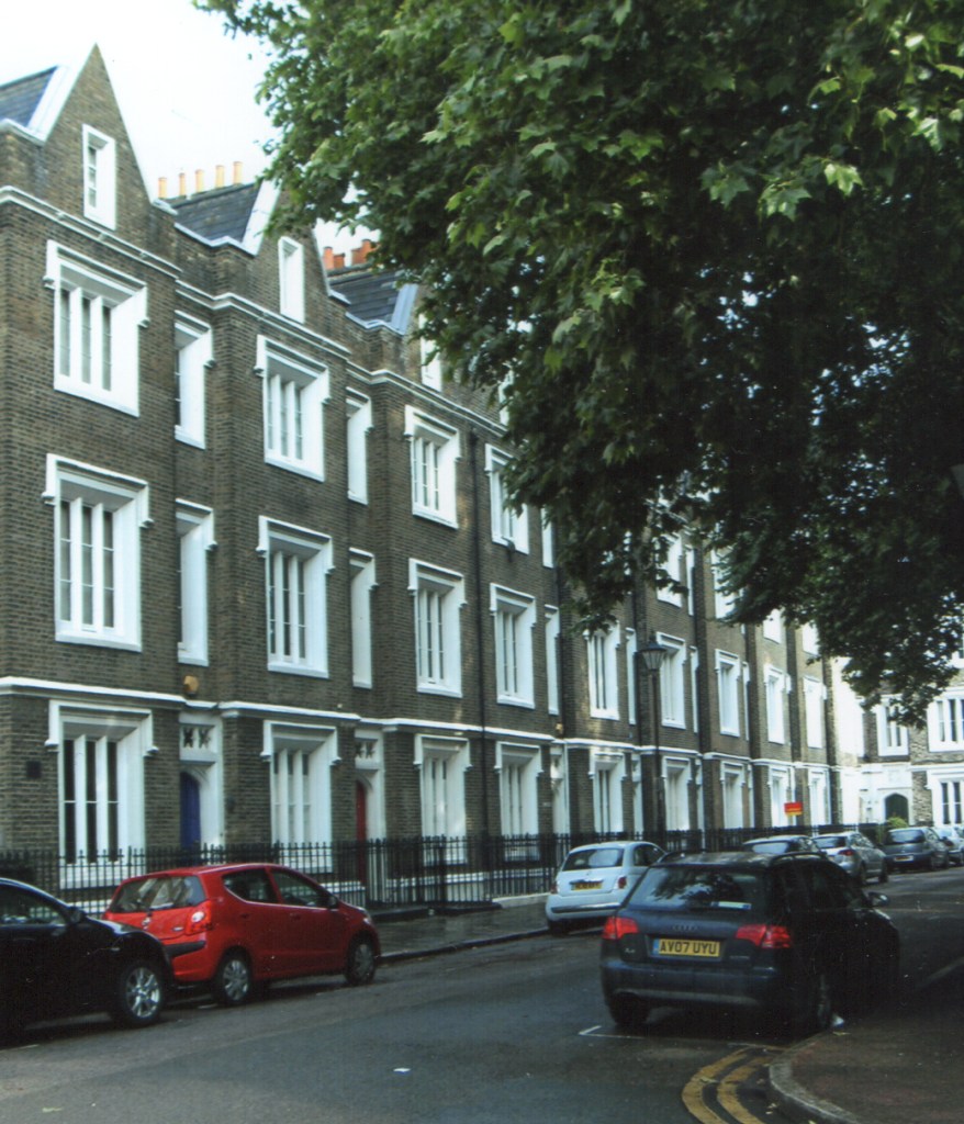 Though revived Classical styles of architecture are the norm in middle-class residential squares, the pointed arches that characterise Gothic architecture were sometimes preferred. In this case, the house doorways have wide, flat arches that were popular in Tudor times.
