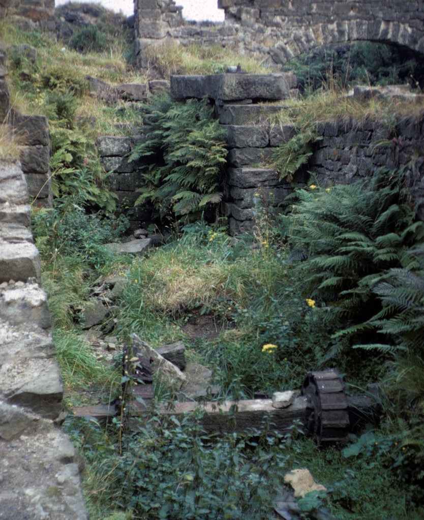 The wrought-iron waterwheel shaft with its cast-iron hubs is shown in more or less its original position within the infilled wheel pit. The opening in the rear wall of the mill behind the wheelpit accommodated the pen trough, which controlled the flow of water onto the waterwheel. The Cheesden Brook waterfall, which was highly advantageous in developing the site, is below the arch.