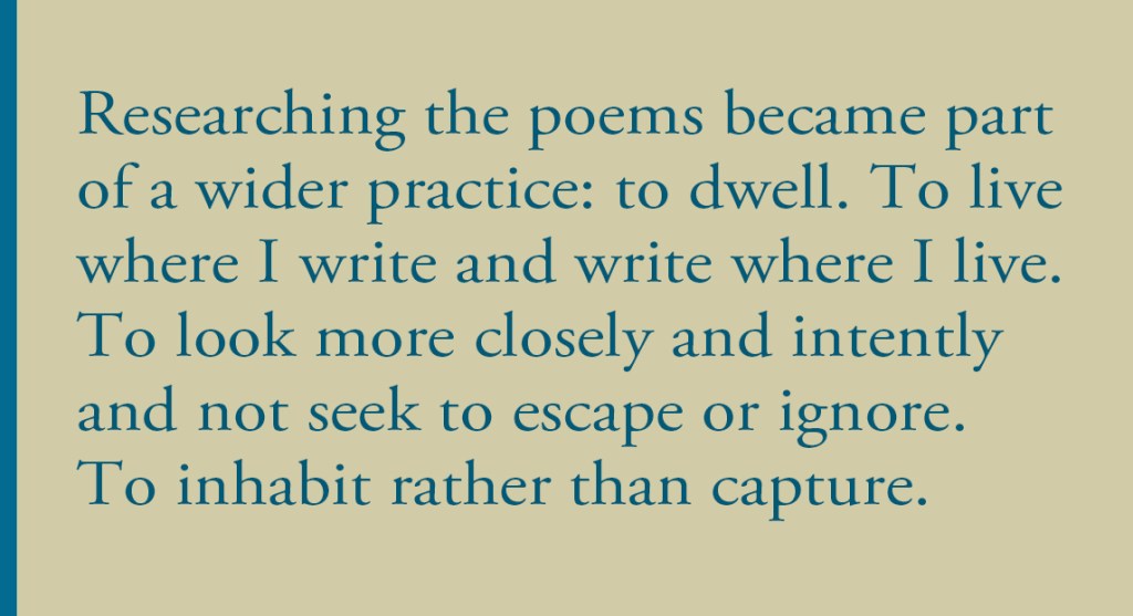 From there, researching the poems became part of a wider practice: to dwell. To live where I write and write where I live. To look more closely and intently and not seek to escape or ignore. To inhabit rather than capture.
