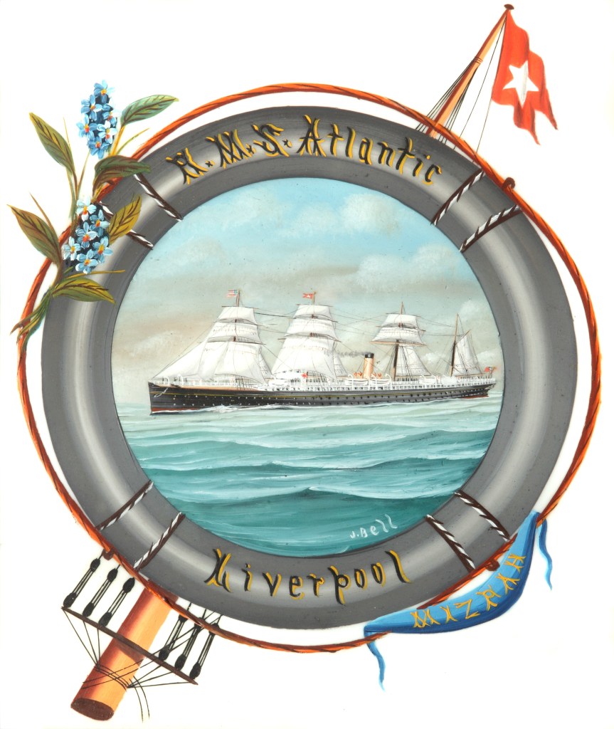 Some painters aimed their work at ordinary seamen. We know James Bell, who produced generic paintings on small sheets of milk glass, undertook at least two of them for fellow seafarers and Aristidius de Clerck’s watercolours were modestly enough priced to be affordable by most mariners – he sold two for £1 10s each and a third one, in a frame, for £2 7s 6d, in 1875.
