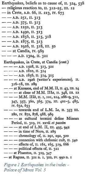 Evans, whose work gave him an intimate knowledge of Knossos, was not only concerned with Minoan life in all its splendour, but also with the periodic destructions that the Knossians and Minoans evidently had to deal with. Evans’ research had led him to consider the potential impact of earthquakes on ancient Cretan society. With ancient earthquakes already in mind, in 1926 he gained first-hand experience of an earthquake at Knossos, of which he wrote a vivid account in his 1928 volume of The Palace of Minos. The earthquake brought about destruction in the town of Heraklion, damaging hundreds of houses and forcing people to camp out. The regular earthquakes that Knossos and Crete had suffered in ancient, medieval, and modern times, he suggested, would have happened in Minoan times too. This could explain the state of some of the archaeological remains at the palace, the way that massive walls had fallen over in a way that seemed impossible to have been caused by human action.