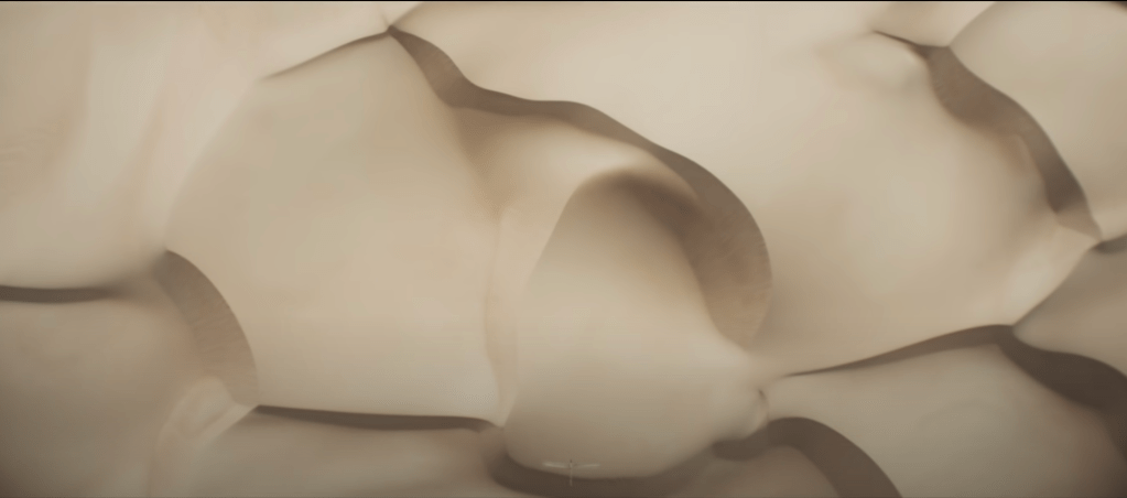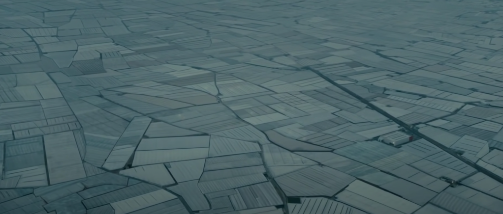 Property ownership is accordingly no greater a concern in Lynch’s film than it was in Herbert’s novel. This absence, however, becomes strangely present in Villeneuve’s version at the moment when the Atreides take flight over the endless rolling dunes, the source of the spice and their (anticipated) future wealth. The Atreides ornithopter crossing the desert, Villeneuve shows us the dunes from above (Figure 1). The desert suddenly appears as a kind of creased map, eluding that demarcation, that spatial legibility on which specifically capitalist private property depends. Compare this moment to Villeneuve’s establishing shot at the beginning of Blade Runner 2049 (now captured from the vantage point of K’s Spinner), in which the protein farms are clearly delimited parcels of space (Figure 2), a futuristic extrapolation of the English enclosures that Marx took as his chief example of ‘so-called primitive accumulation’ at the end of the first volume of Capital. Land has a different significance in Dune, Villeneuve indicates: no longer subject, passively, to capitalist rationalisation, it resists efforts to commodify it, a defiance embodied in those anthropic instantiations of ‘desert power’, the Fremen, and the Shai-Hulud, the great sandworms that the Fremen revere.
