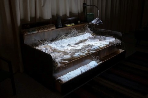 A cramped apartment: dim sitting room, bedroom, and kitchen, lit only by warm glow pooling under several lampshades. Water flickers across crumpled bedsheets over a straw-stuffed bed. Birch trunks grow out of kitchen cupboards. Three old TV screens project scrublands from outside into this interior, inhabited only by voices. They recall scenes of arrests and beatings. A sewing machine unexpectedly whirs – a machine gun.