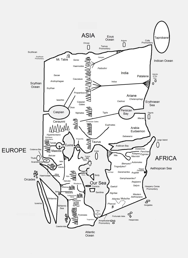 Many things really intrigued me as I delved deeper into this text. For example, Mela was a native of southern Spain, and thus the product of a rich multi-cultural society, including Phoenician, Greek, and Roman. And Mela often forefronted his North-African Phoenician heritage, including his deep interest in the myth of Hercules (identifiable with the Phoenician god Melqart) and his use of the Pillars of Hercules as a geographical frame: Mela’s world started and ended with the Pillars, and the reader is taken back to the Pillars close to the work’s midpoint. In addition, Mela’s view was of a world inhabited by peoples in a puzzling and tangled up order: the world is thus a puzzle to be unfolded and decoded. From time to time Mela was certain to remind the reader of the world’s puzzling arrangement. Furthermore, Mela’s landscape is a fully anthropomorphized and vilified personality. This “ethical landscape” can be nurturing or dangerous, and it sometimes accommodates human interests and elsewhere impedes them, aligning with the Greek and Roman prejudice that everything (land, flora, and fauna) exists in service to humankind. I was also fascinated by his use (and misuse) of his predecessors, including his artful allusions to great Latin and Greek writers, and his “adaptations” (to put it politely) of information recorded in those hoary sources. I wonder if this is a product of Mela working in several languages at once: Latin, Greek, and possibly even Phoenician. Moreover, like other writers of his time, Mela was fascinated by the paradoxical, and his prose sparkles when he describes paradoxical phenomena: Psammetichus’ labyrinth, the Corycian cave, the phoenix.